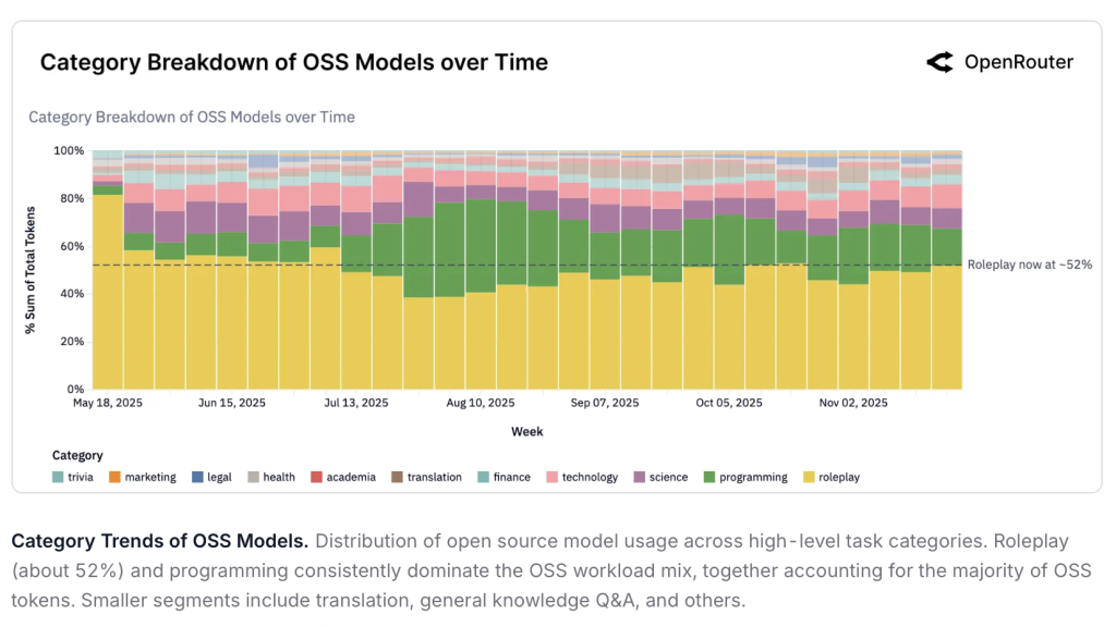 Perhaps the most surprising discovery: more than half of all open-source AI model usage isn’t for productivity at all. It’s for roleplay and creative storytelling.